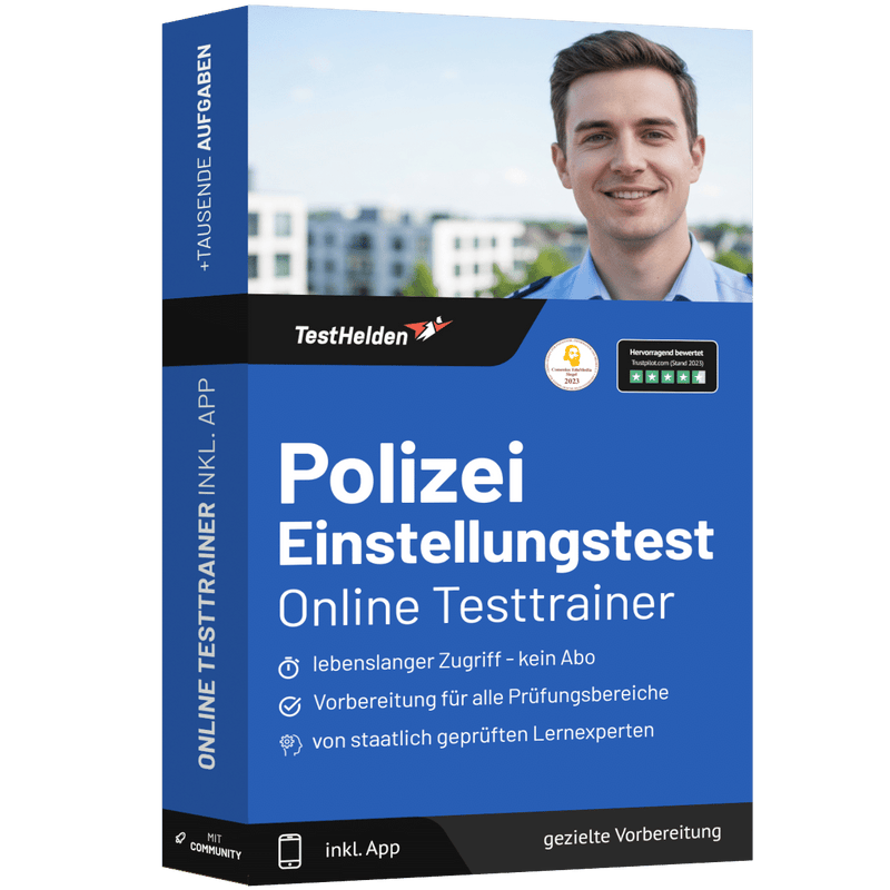 Bereit für deinen Einstellungstest bei der Polizei? Mit unserem digitalen Vorbereitungskurs bist du optimal gerüstet! Tausende Übungsaufgaben, hilfreiche Erklärvideos und Unterstützung durch erfahrene Trainer helfen dir, jedes Thema zu meistern. Zudem profitierst du von einer aktiven Community, die dir bei Fragen zur Seite steht.